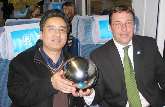 Mr. Achim Steiner, UN Under-Secretary-General, together with Mr. Li Xiang were holding up the ¡°Earth¡±