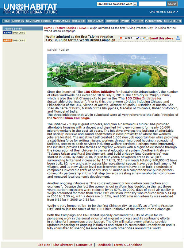 2009年,应联合国人居署邀请,武进开始按照联合国人居署的标准,对城市人居改善工作进一步提升,并于年底启动“联合国人居环境特别荣誉奖”、“全球100可持续城市”申报程序。经过历时半年的重重评审,武进提交的三个范例――“新市民公寓:帮扶外来工人,规划和谐未来”、“城乡统筹发展,幸福新农村”及“经济增长与低碳建设一体发展”等行活保障制度、新型合作医疗保障制度,被征地农民社会养老保障和城市居民的统一;实现了外来劳动力及其子女在居住、入学教育、医疗、社会保障等方面与本地居民统一;武进,更实现了城乡居民收入差距在全国都最小的发展水平。此项计划开始于2006年,选择“五镇十村”为代表全面启动新农村示范点建设,2008年,武进再启动“千企联百村、共建新农村”活动,探索建立以工促农、以企带村联动发展的新机制。至2010年初,短短的4年时间,武进农村发生了令人瞠目结舌的变化,新增村庄绿化面积达2.5万亩;新建村组道路311条计96万平方米; 76个村新建了健身广场82个,新建村级公共服务中心37个,上百个企业的近3亿元投资彻底解决了武进农村经济发展的资金问题。武进的农村,实现了“村村有广场、日日大家乐”的幸福场景。