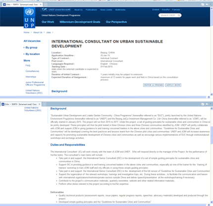 2015年1月9日,作为联合国系统内“帮助发展中国家地区加强经济和社会发展”、向发展中国家提供技术援助的专门职能机构,联合国发展计划署(UNDP)官网正式向全球发布招募令,为“SUC可持续城市与社区项目”组建专家。