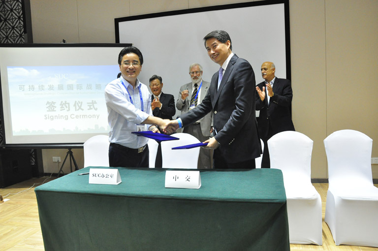 日前,在深圳召开的2016年“SUC可持续城市与社区发展论坛”上,“SUC项目”办公室与 “中交集团·中交地产”和“中节能集团·中节能实业”两大央企现场签署《可持续发展国际战略合作备忘录》及《项目实施合作协议》,宣布将在联合国支持下,依据“SUC国际可持续标准”,联手在华建设首个“可持续社区”全球新样板。中交地产总经理张世文和中节能集团副总经理陈涛与SUC项目执行主任、佳粹CEO李响现场签约。联合国原副秘书长、联合国可持续发展大会秘书长沙祖康、联合国环境署可持续发展部司长阿拉伯·浩巴拉、全球生态城之父艾罗·帕罗海默等出席见证。