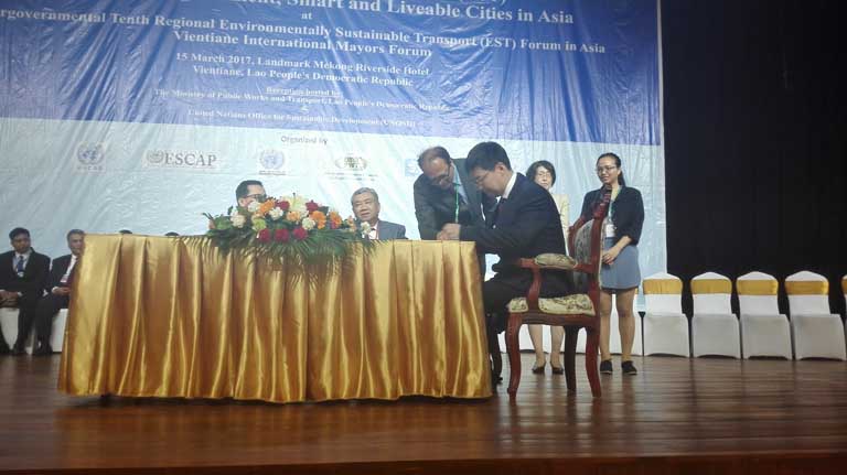 会上,联合国可持续发展办公厅主任Jong Soo Yoon, SUC项目国际技术顾问Robert Earley及SUC项目执行主任李响等为湛江市隆重举办授牌与启动仪式。本次论坛同时发布可持续发展老挝宣言,在“京都宣言”的基础上,致力于推广环保可持续交通,实现弹性、智慧、宜居的亚洲城市,中国湛江市、延安市政府代表及各国政府部门与城市代表隆重出席签约仪式。