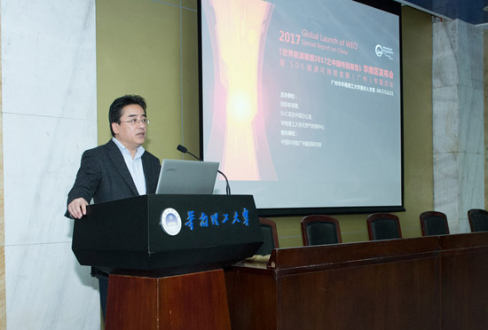 来自SUC示范项目办公室、国际能源署、华南理工大学、中国科学院广州能源研究所、中国能源建设集团广东省电力设计研究院、中山大学、广州大学、中国(深圳)综合开发研究院、广西社会科学学院、广东油气商会、广东省低碳发展促进会、广东省低碳产业技术协会、广东省能源检测研究院、广东省应对气候变化研究中心、广东省充电设施协会、喜威(中国)投资、广州朗源燃气、广州泉能智能科技以及华南理工大学、中山大学、广州大学师生代表150余人出席会议,与会专家就《世界能源展望2017之中国特别报告》,中国尤其是广州市能源相关产业发展所面临的机遇、挑战及政策发表点评和精彩演讲。本次会议包括“开幕致辞”、“报告发布”、“专家讲坛”、“研讨对话”四大环节。 发布会暨论坛由国际能源署署长高级顾问、国家能源局油气司原副司长杨雷主持,SUC示范项目办公室执行主任李响作为组委会负责人介绍到场嘉宾及会议背景概要,华南理工大学机械与汽车工程学院党委书记晋刚教授、华南理工大学天然气利用研究中心主任兼广州市能源学会副理事长华贲教授、中国能源建设集团广东省电力设计研究院梁汉东副院长做致辞发言,中国科学院广州能源研究所能源战略与低碳发展研究室蔡国田副主任就广州市能源发展前景展望做专题演讲。
