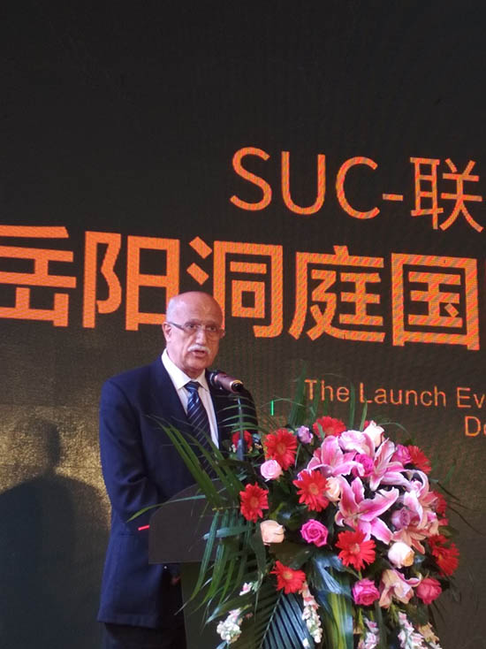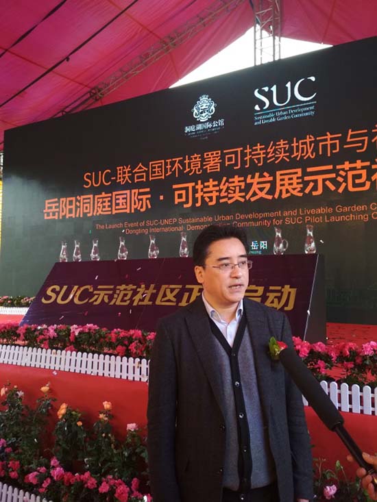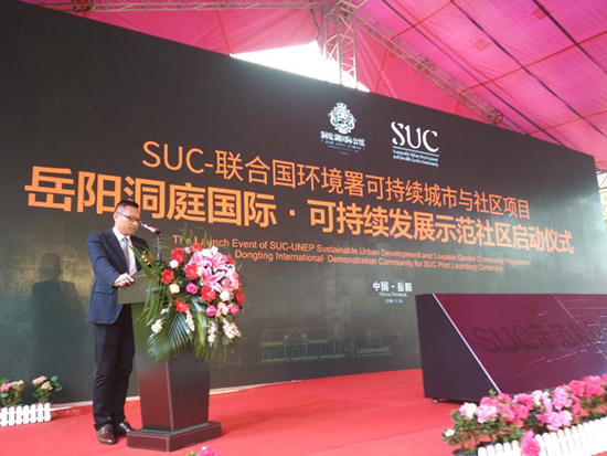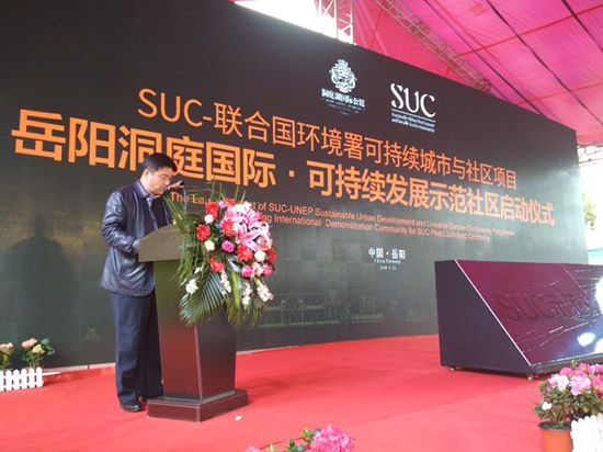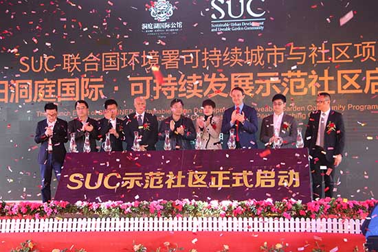 “可持续城市与社区项目”(即“SUC项目”)是联合国系统的官方合作项目,2009年由联合国环境署与佳粹环境签署备忘录,2015年由SUC项目管理中心与联合国环境署共同启动,致力为中国及发展中国家编制“可持续城市与社区标准”、“搭建可持续发展国际合作平台与智库”、在华率先建设“可持续发展示范城市与社区”全球样板,并在发展中国家全面复制、推广。联合国人居署、联合国可持续发展办公厅、国际能源署及国内外数十个机构先后加入项目合作、标准编制工作。2018年2月11日,联合国第九届世界城市论坛正式发布首批城市与社区示范,岳阳洞庭湖国际公馆成为全球首批“SUC可持续发展国际示范社区”。 25日上午,“岳阳洞庭国际·SUC国际可持续发展示范社区启动仪式”在项目营销中心隆重举行,SUC联合国专家组及SUC项目组成员、岳阳市政府、南湖新区工委(管委会)的领导专家以及数十家媒体代表出席。活动包括“嘉宾致辞、标准解读、启动仪式、媒体采访”四大环节。Arab Hoballah,岳阳市政府副秘书长周金龙先生,岳阳市南湖新区管委会工委副书记、管委会主任雷欣女士,南湖新区工委委员、管委会副主任苏正明先生,南湖新区工委委员、政法委书记张朝东先生、洞庭国际项目总经理曹文分别致辞。Arab Hoballah表示:“我相信,通过未来3年的营造,洞庭湖国际公馆将跻身国际一流水平,引领全球可持续社区的发展。不久的将来,人们还将意识到它对推动岳阳乃至中国城市与社区可持续发展建设的积极意义。”他还表示,未来非常乐意将洞庭湖国际公馆的优秀范例在全球推广,包括推向“一带一路”沿线发展中国家。 Robert Earley对《SUC可持续社区标准》进行了详细解读,这是继该标准在吉隆坡第九届世界城市论坛之后,在中国的首次全面讲解。据介绍,《SUC可持续社区标准》是基于《联合国2030可持续发展议程》的目标、由联合国环境署牵头,联合国人居署及国内外各相关机构参编而完成的发展中国家可持续城市与社区建设的全新国际化标准,近期将全部编制完成并计划上半年全面发布。